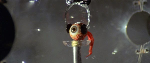 And then – oh dear. The ‘last image can be recovered from the victim’s eyes’ crap. This is why I quit watching Fringe the first time it aired. It’s still dumb… but it does look kinda cool, with eyeballs, lasers, glass globes, and a blurry image projected on a circular screen.