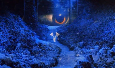 The production is heavily stage-bound, with only the occasional location shooting. Fine for interior locations, but for exteriors shot on a sound-stage… well, in general I’ve found this stultifying in other productions – limiting scope and scale and imposing a “packaged” feeling on a film. Somehow the director of Kwaidan, Masaki Kobayashi, transcends these limitations – even uses them to give us fantastic vistas that would be impossible on a location shoot. The sky – illuminated by the northern lights – becomes a vista of eyes, following the action just as we do. A snow-swept forest feels just as cold and dangerous as the real thing – yet also poetic, controlled – a work of art.