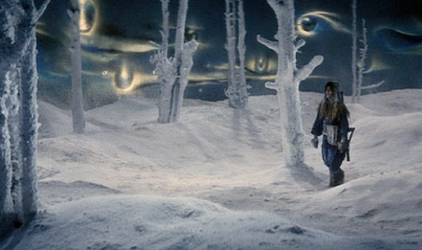 The production is heavily stage-bound, with only the occasional location shooting. Fine for interior locations, but for exteriors shot on a sound-stage… well, in general I’ve found this stultifying in other productions – limiting scope and scale and imposing a “packaged” feeling on a film. Somehow the director of Kwaidan, Masaki Kobayashi, transcends these limitations – even uses them to give us fantastic vistas that would be impossible on a location shoot. The sky – illuminated by the northern lights – becomes a vista of eyes, following the action just as we do. A snow-swept forest feels just as cold and dangerous as the real thing – yet also poetic, controlled – a work of art.