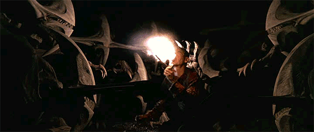 In a disaster movie, the external threat is usually magnified by internal conflict and Pitch Blackimmediately gives us that in spades with the presence of Riddick (Vin Diesel), a gravely-voiced killer with ‘shine job’ eyes that let him see in the dark. Though he starts out as a prisoner of Johns (Cole Hauser), it’s not long before he’s loose, ratcheting up the tension as the survivors look for supplies and a way off the desert world they’ve found themselves on.