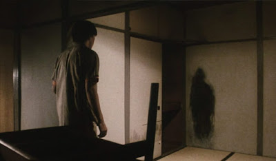 In both story threads things start to get weird. Yabe gets a call from the dead Taguchi, whose voice pleads ‘help me.’ He goes to Taguchi’s apartment where he sees a black stain on the wall where Taguchi committed suicide – he also finds a crumpled piece of paper with the words ‘the forbidden room’ on it. This appears to refer to a room in the basement of the building with a door that is sealed with red tape. When Yabe goes into the room he is confronted and cornered by what appears to be a ghost. This seems to unnerve him completely, and soon he too has vanished into a stain in the wall.