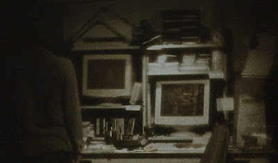 The primary character in the first thread is Michi, with her friends Junko and Yabe. They’re expecting a piece of software from another employee, Taguchi, who they haven’t heard from in a few days. Michi goes to visit him and while she looks through his stacks of disks he casually goes around the corner and hangs himself. Later, looking at the disk he made for them, the friends find an image of Taguchi standing next to his stack of monitors, one of which contains the same image, causing an infinite series of the same image. In another monitor they can see what looks like a ghostly face.