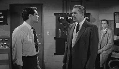 The Return of the Fly is shot in black and white (though still in Cinemascope), has only one returning cast member (Vincent Price), and eschews the slow burn mystery for something more like a thriller or film-noir crime picture. Fox appears to have done everything it could to get out a sequel quickly, including use of existing sets from the first film. (There’s a scene in Andre Delambre’s lab in which his message to his wife – including the shaky “I love you” – is still visible on the chalkboard in the background. It’s particularly poignant as the scene takes place after the funeral of Helene.)